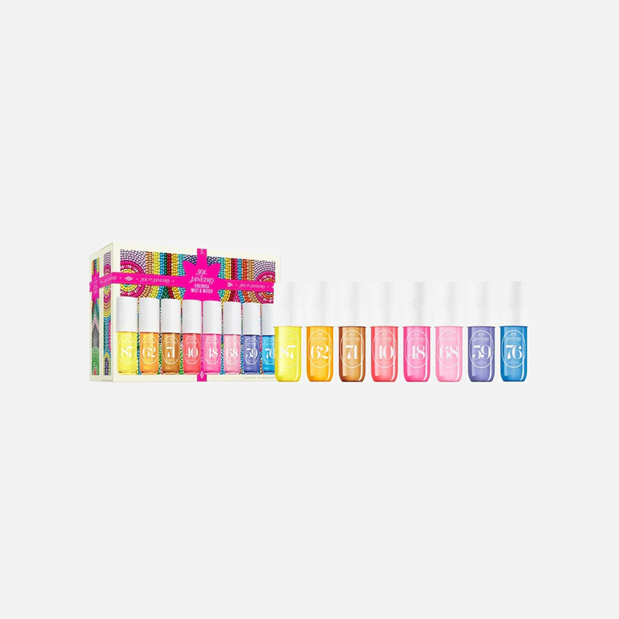 Conviértete en la estrella de fin de año con la nueva colección Holiday de Sol de Janeiro: prepárate para una temporada radiante con perfumes y cuidados corporales icónicos para celebrar con estilo. Nuestro cofre de brumas perfumadas es el regalo definitivo para coleccionar todas las brumas de Sol de Janeiro: la solar e icónica Cheirosa 62, la sensual y delicada Cheirosa 40, la envolvente y floral Cheirosa 68, la intensa y aterciopelada Cheirosa 76, la fresca y golosa Cheirosa 59, la cálida y reconfortante Cheirosa 71, la tropical Cheirosa 48 y la nostálgica Cheirosa 87.